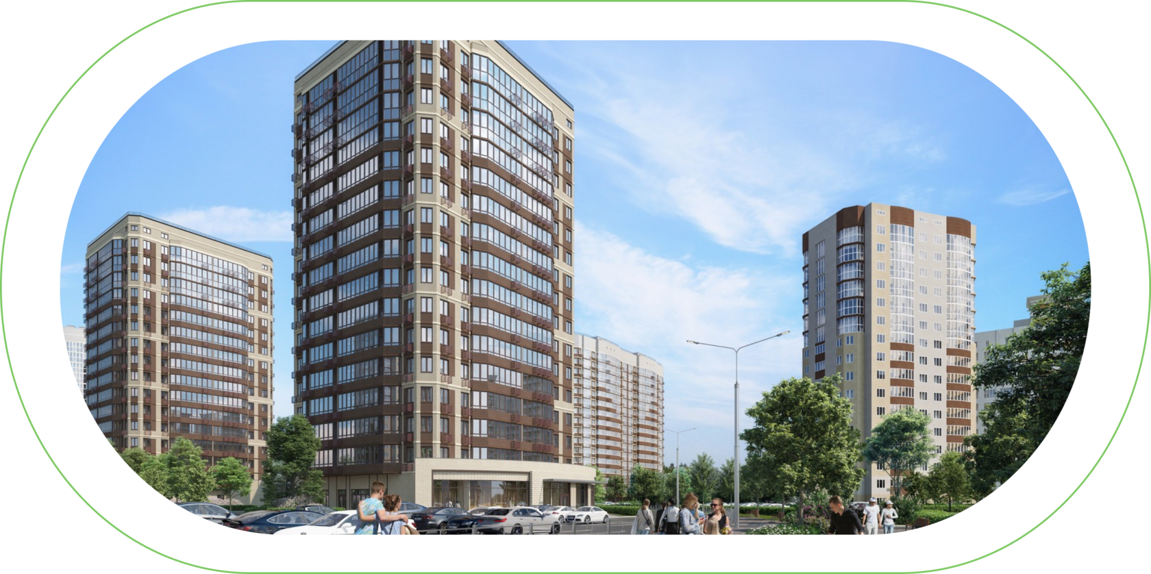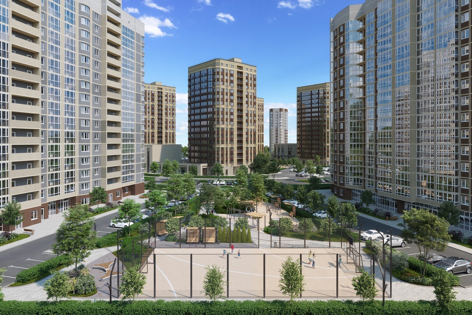 Предполагает просторные дворы с качественным пышным озеленением с автоматическим поливом, безопасными детскими, спортивными площадками, зонами отдыха для людей любого возраста.